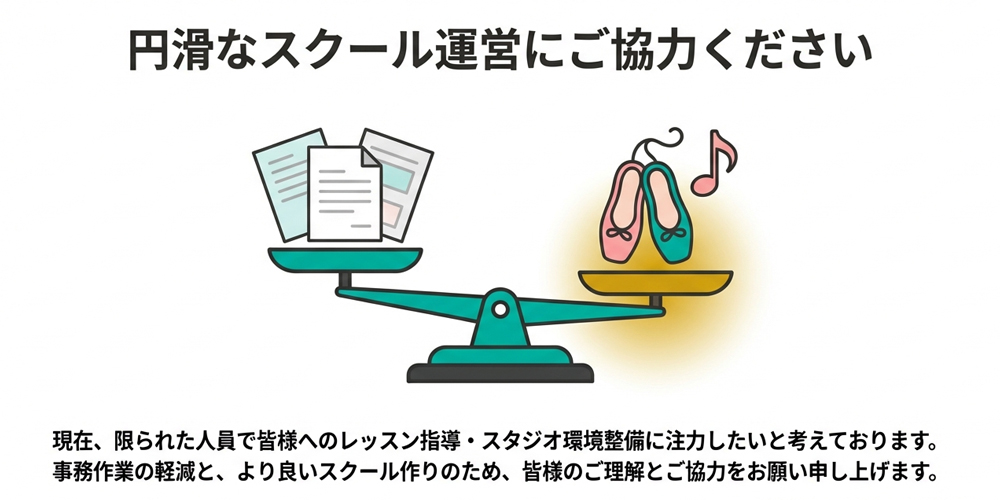 当スクールでは少数精鋭の限られた人員で運営し、事務負担による人件費の増大を抑え、可能な限りレッスン費を据え置く企業努力を重ねています。しかしながら物価高などによる昨今の情勢を鑑みると限界ではあります。そんな厳しい状況が続いてはいますが、僅かながらでも事務負担を減らし、皆様へのレッスン指導に注力するよう努めています。事務作業の軽減に何卒ご理解とご協力をお願い申し上げます。
