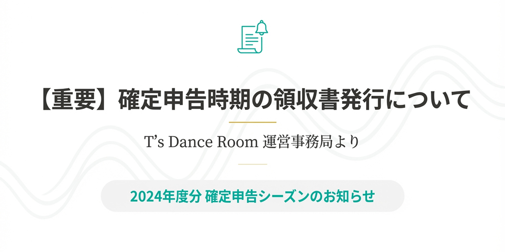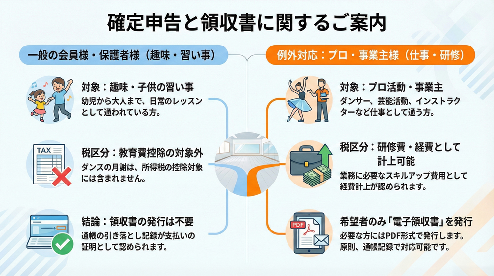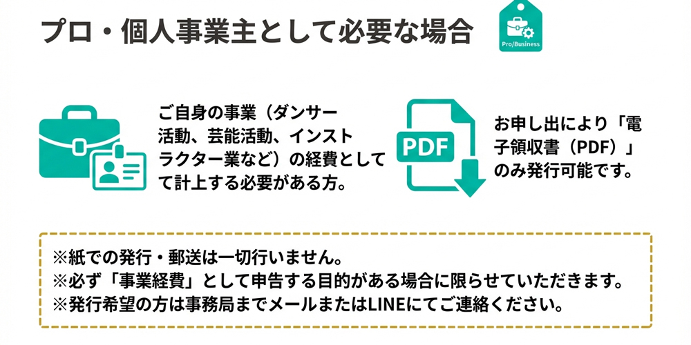 プロのダンサーの方、あるいは芸能活動等で「事業経費」として計上が明確に必要な方に限り、お申し出があれば「電子領収書(PDF)」にて発行いたします。