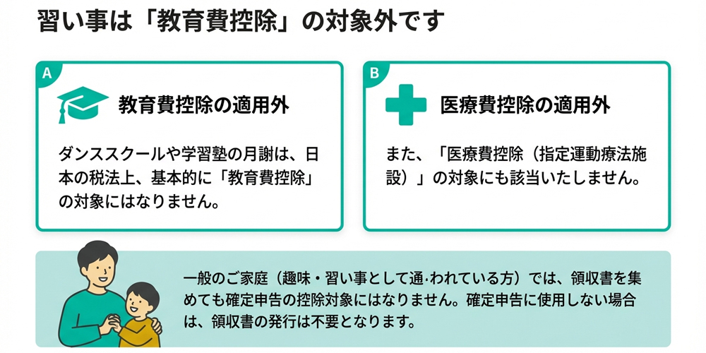 よくある誤解として、「習い事の月謝を確定申告すれば税金が戻る」と思われているケースがございますが、日本の所得税法においてダンススクール等の習い事は「教育費控除」の対象外です。医療費控除の対象(指定運動療法施設)にも該当いたしません。 一般的な会社員・ご家庭の場合、領収書があっても確定申告には使用できませんので、あらかじめご了承ください。