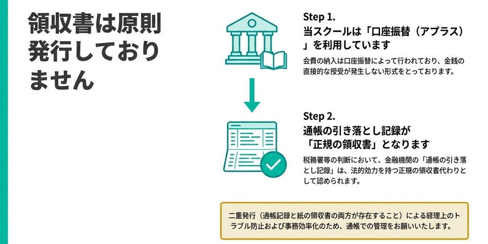 当スクールでは口座振替(アプラス)を利用しております。税務署等の公的機関において、「通帳の引き落とし記録」は正規の支払証明書(領収書の代わり)として認められております。 二重発行防止および事務手続きの観点から、個別の領収書発行は原則行わない方針としております。通帳の記帳をもって代えさせていただきますようお願い申し上げます。
