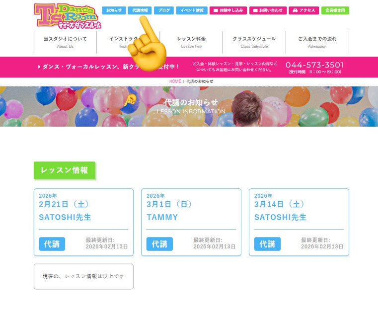 当スクールの情報やお知らせは、当サイトの『お知らせ』ページに投稿しています。また、投稿した同ページをプリントアウトして、AスタジオおよびBスタジオに掲示しています。定期的にお知らせページをご確認いただくか、定期的にスタジオにお越しいただき、内容をご確認くださいますようお願い申し上げます。
