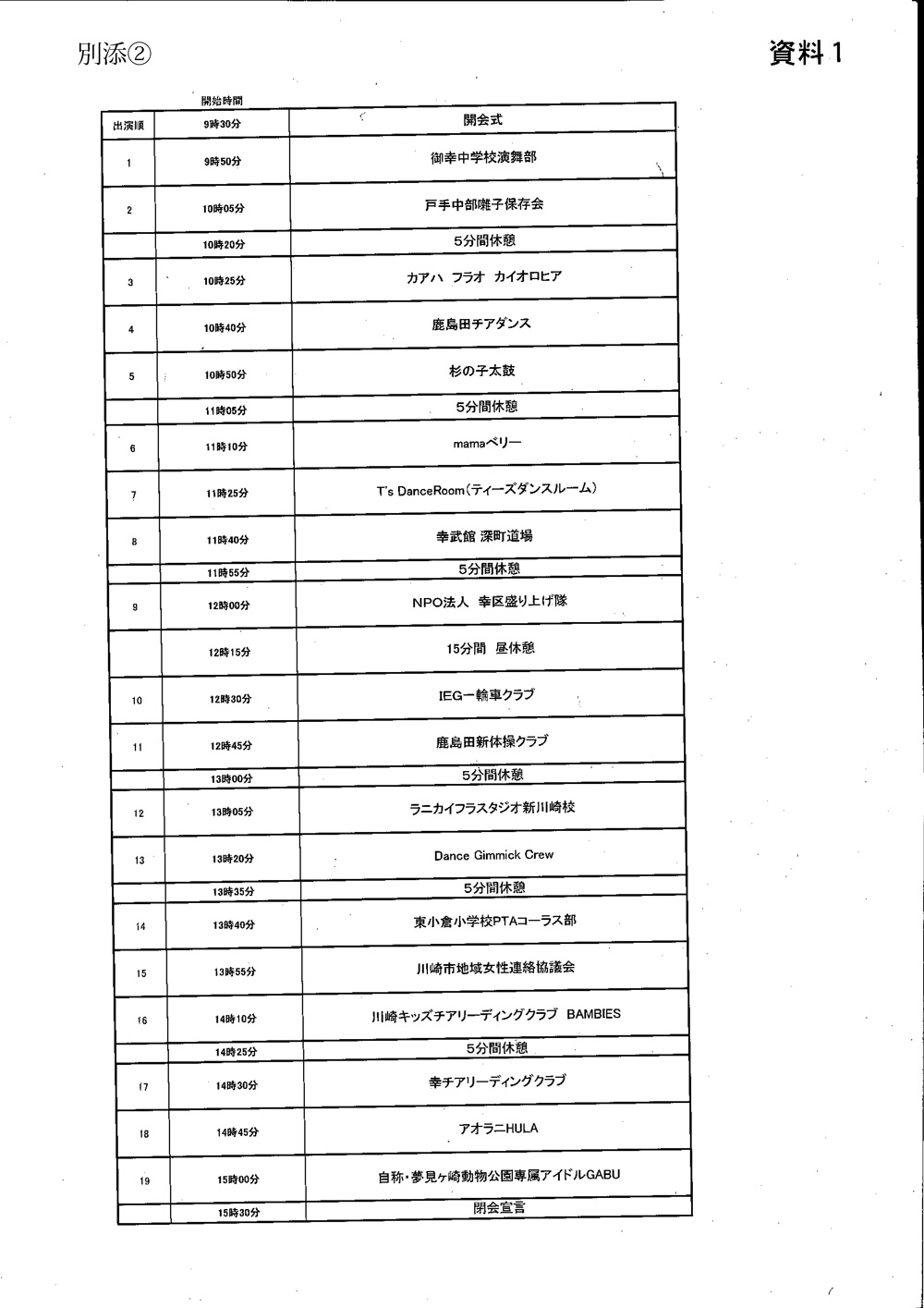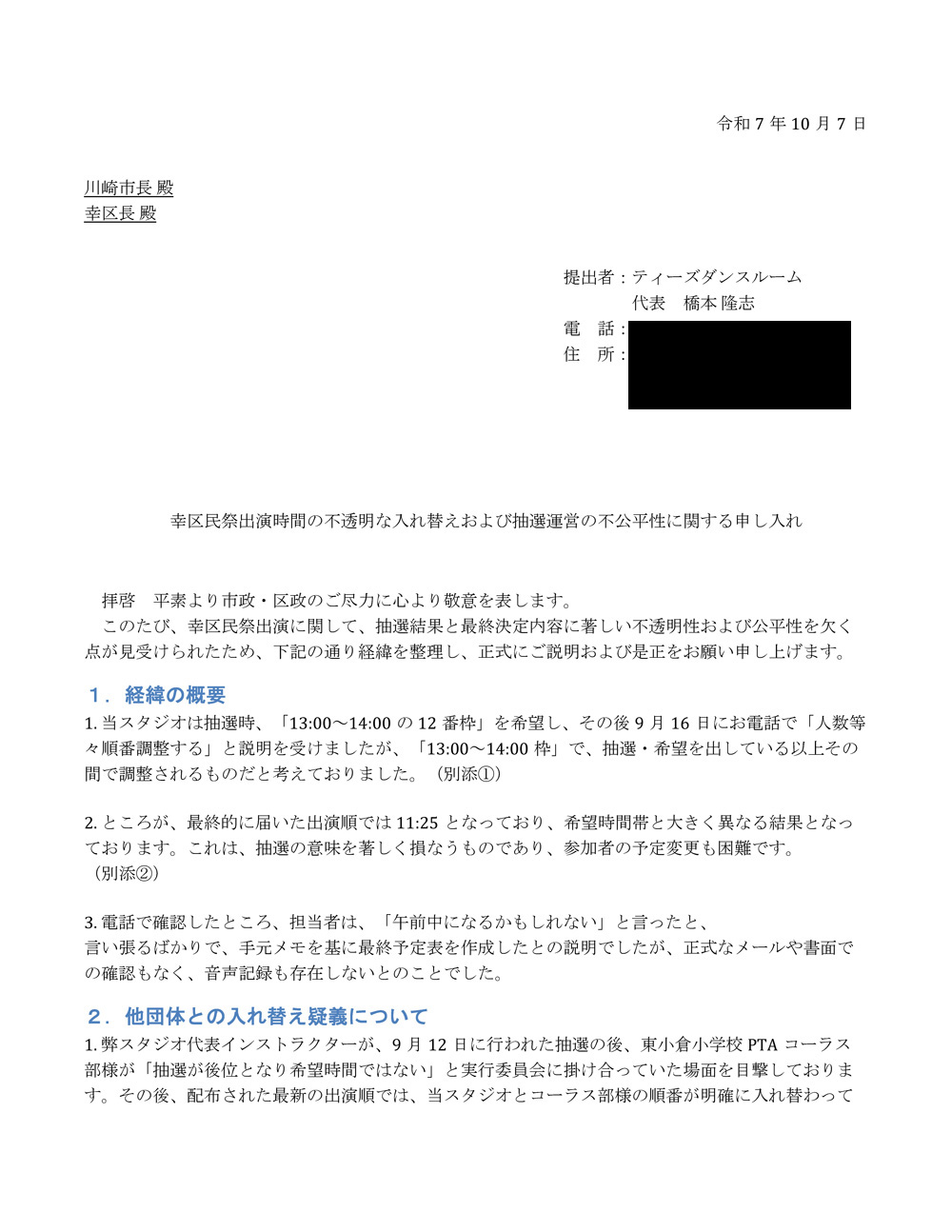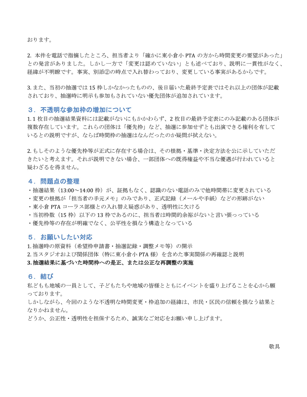 ここに記載されている件は、10/6時点では舞台担当の僅か1名のみしかお話できていません。残念ながら実行委員会や区役所総務課や区議さんや区長さんとはお話できていません。問いただそうにも、元の抽選で決めた抽選枠に戻して欲しいと言おうにも、舞台担当者以外との話を担当者に拒否されています。