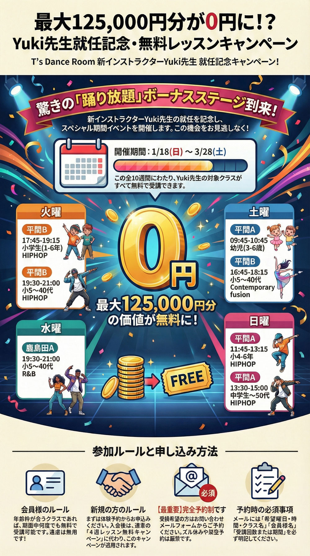 新規の方は体験予約フォームにてお申込みください。期間中にご新規でご入会された方も無料レッスンの対象となりますが、ご入会後に初回から4回目までの4週レッスン無料キャンペーンは消化されます。また、ご入会クラス以外のクラスにも参加可能となりますので、ご希望がある場合はお問合せメールフォームからお申込みのご連絡をください。